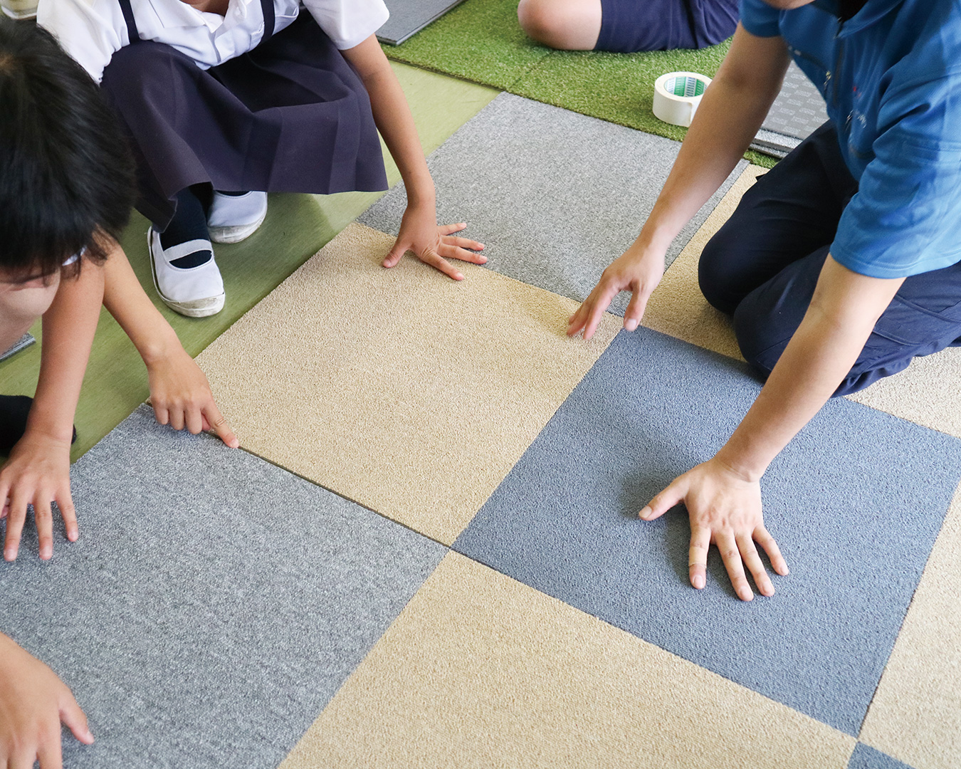 子どもたちはタイルカーペットと人工芝タイルの施工作業中も、楽しそうに声を掛け合いながら協力し、次第に教室の床が美しく整っていく様子に喜びの声が上がり、従業員も子どもたちの熱心さや笑顔に触れ、大変感銘を受けました。